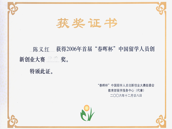 2006年12月,獲教育部、科技部、人事部等主辦的“首屆“春暉杯”中國留學(xué)人員創(chuàng)新創(chuàng)業(yè)大賽”優(yōu)秀獎(jiǎng)