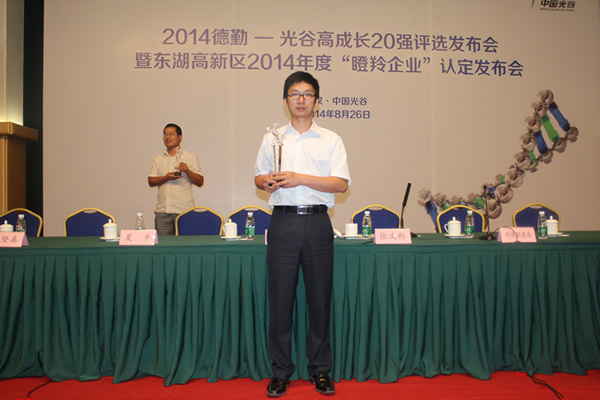 8月26日下午,東湖高新區(qū)管委會(huì)舉行2014“德勤-光谷高成長(zhǎng)20強(qiáng)”項(xiàng)目暨東湖高新區(qū)“瞪羚企業(yè)”認(rèn)定發(fā)布會(huì),約300名高成長(zhǎng)企業(yè)高管、“瞪羚企業(yè)”代表﹑政府領(lǐng)導(dǎo)等參加了會(huì)議。新特光電連續(xù)三年榮獲“瞪羚企業(yè)”稱號(hào),并成功入選“德勤-光谷高成長(zhǎng)20強(qiáng)"。