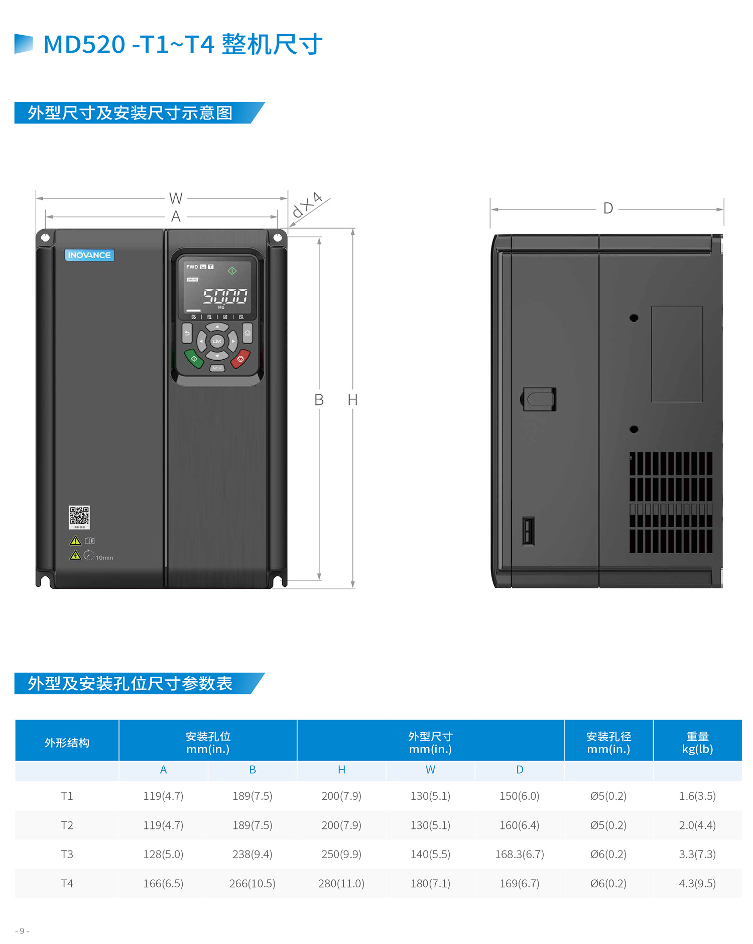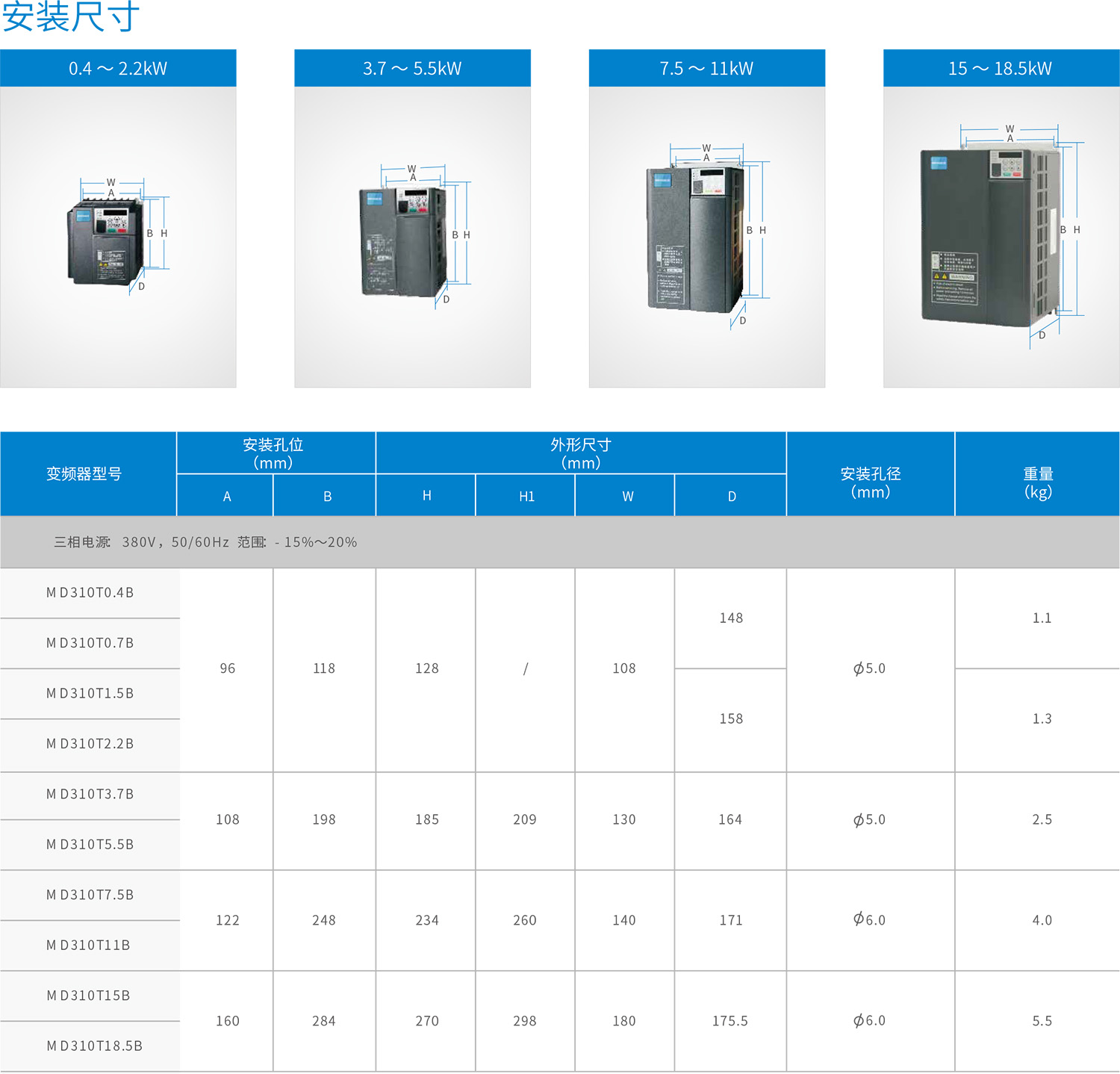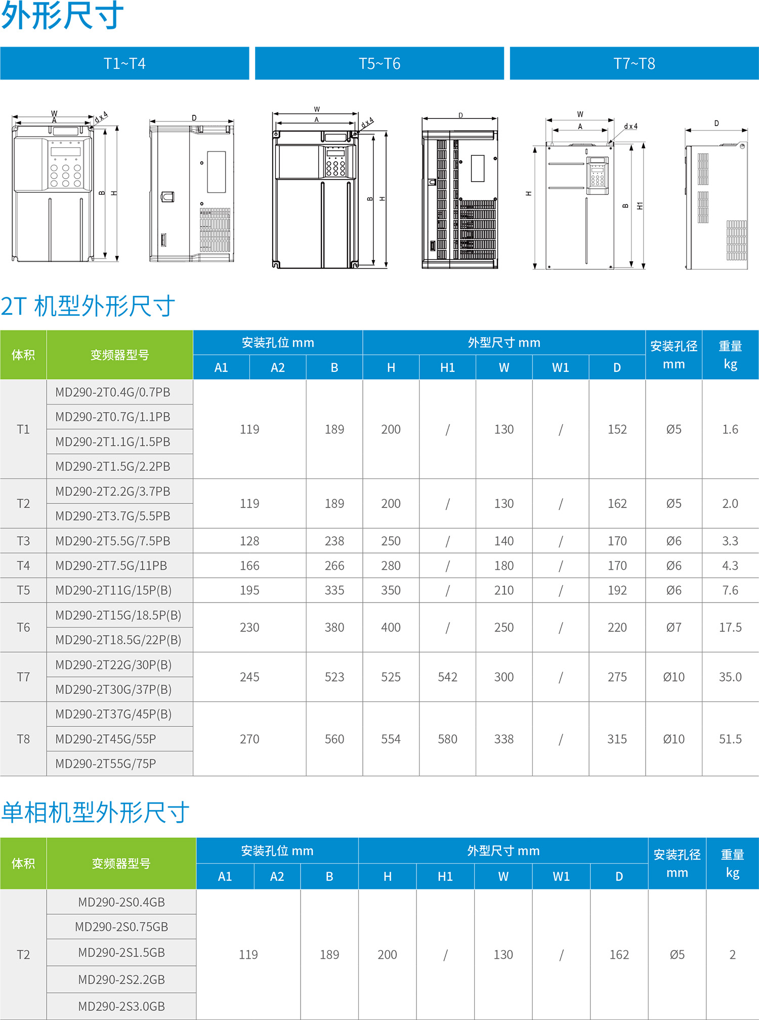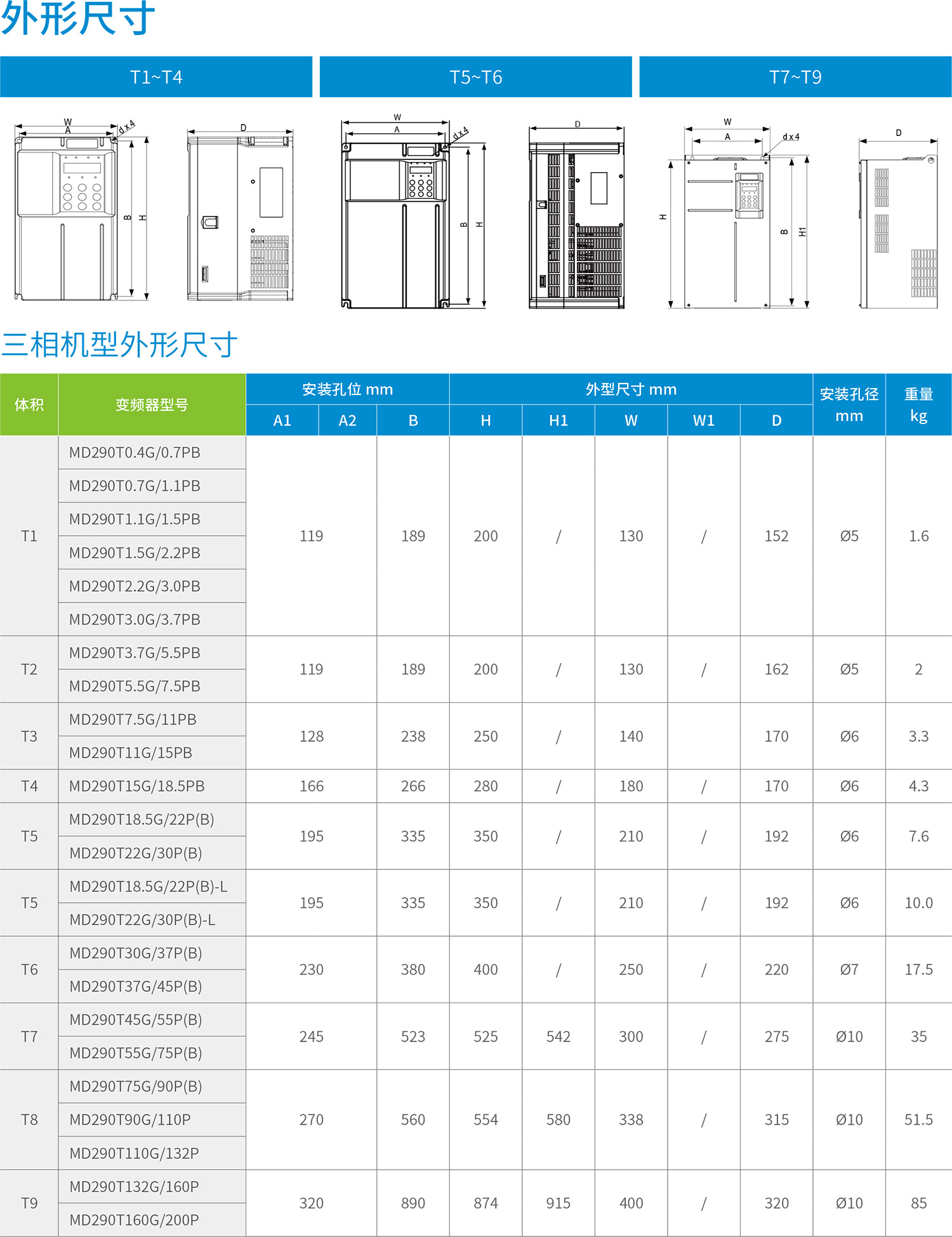 | 型號(hào) | MD290T3.7G/ 5.5PB | MD290T5.5G/ 7.5PB | MD290T7.5G/ 11PB | MD290T11G/ 15PB | MD290T15G/ 18.5PB | ||||||