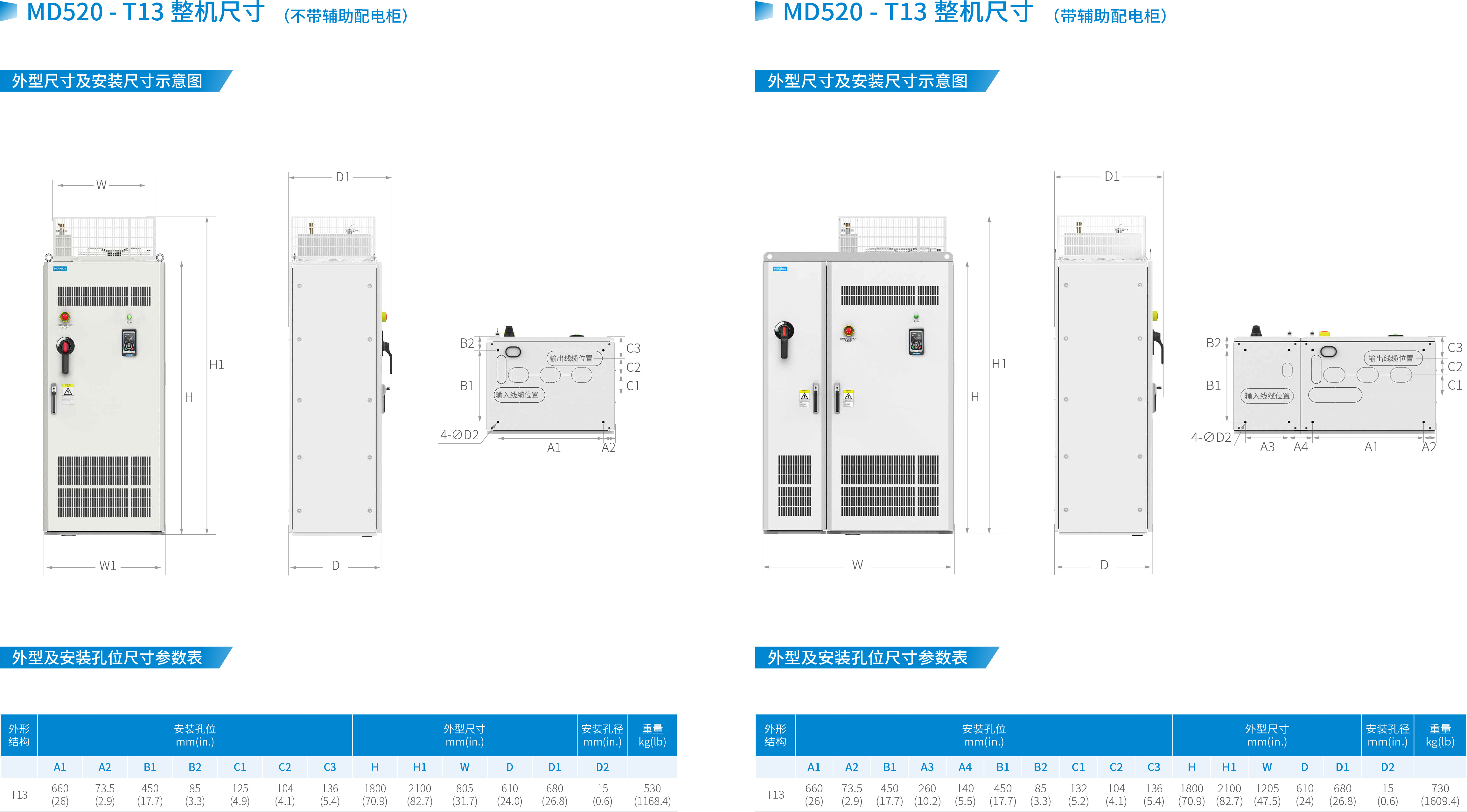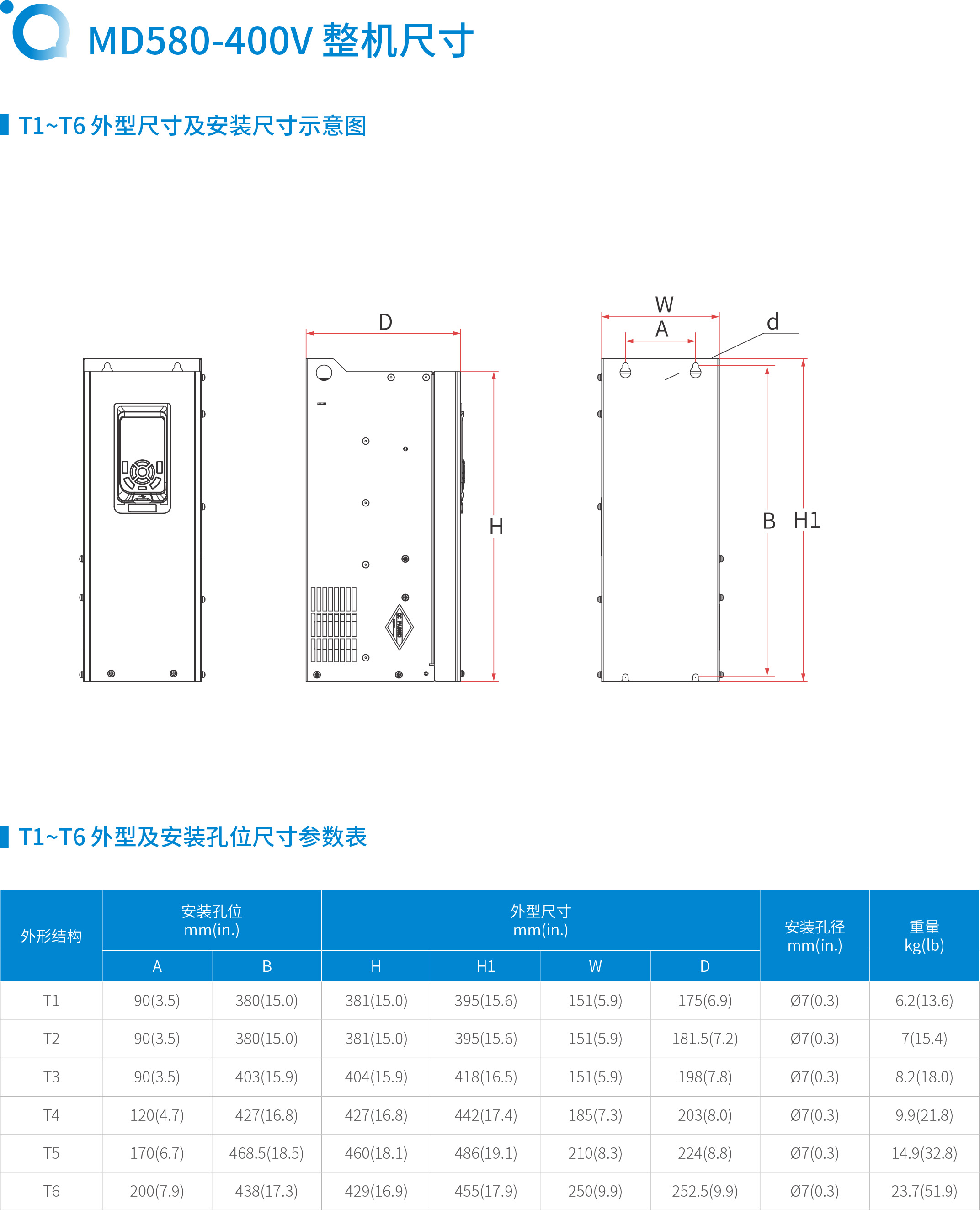 | MD520-2T15(B)(S) | T6 | 26.1 | 57.0 | 15.0 | 20.0 | 60.0 | 31.6 | 71.0 | 18.5 | 25.0 | 75.0 |