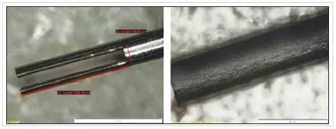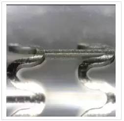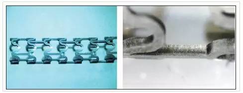 從圖中可以看見光纖激光切割的支架內(nèi)壁上熔渣的尺寸甚至大過管壁的厚度,且由于熔渣阻礙,無法將落料移除,需要先研磨才可將之去除。研磨內(nèi)壁不僅費(fèi)工費(fèi)時(shí),而且容易磨出豁邊,造成機(jī)械性能的下降。如圖右所示,由超快激光所切割的支架,不但沒有熔渣而且表面光滑。