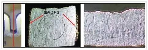 圖五:超快激光切割的316L 不銹鋼支架的金相觀察。圖左為金相 截面位置示意圖,圖中為不銹鋼支架金相,圖右為未加工的316L不銹鋼管金相