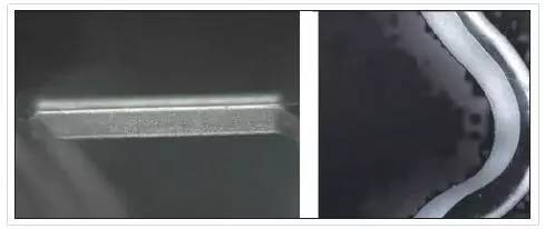 圖四:超快激光切割細(xì)304 不銹鋼管。圖左為管子方形槽全貌,圖右為管子對面內(nèi)壁。