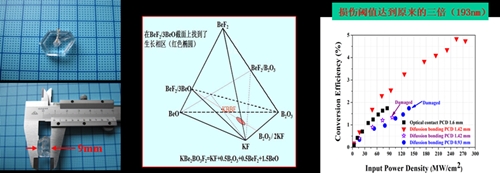 在KBBF晶體和器件研制方面,理化所突破了大尺寸KBBF晶體穩(wěn)定生長技術(shù),并通過研究晶體生長相區(qū),提高了產(chǎn)品成品率;發(fā)明了棱鏡耦合倍頻技術(shù),形成了器件的穩(wěn)定加工工藝,并將損傷閾值大幅度提高。