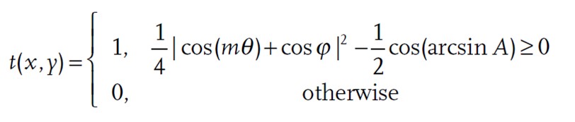 t(x, y) 的值從0到1之間連續(xù)變化,這樣的全息圖可以通過將連續(xù)值離散為多個級來實驗實現(xiàn),從而產(chǎn)生多級振幅元素。盡管它能很好地再現(xiàn)所需的球面波,但多層掩模的制造是具有挑戰(zhàn)性的,因為需要精確控制具有不同透射率的多個掩模的灰度。為解決這一難題,我們尋找一種編碼技術(shù)來獲得僅二進制振幅的全息圖。我們根據(jù)與振幅相關(guān)的閾值截斷傳輸函數(shù) t(x, y),然后,我們將小于和大于閾值的t(x,y)的值分別設(shè)置為0和1。以這種方式,僅二進制振幅的全息圖可以表示為
