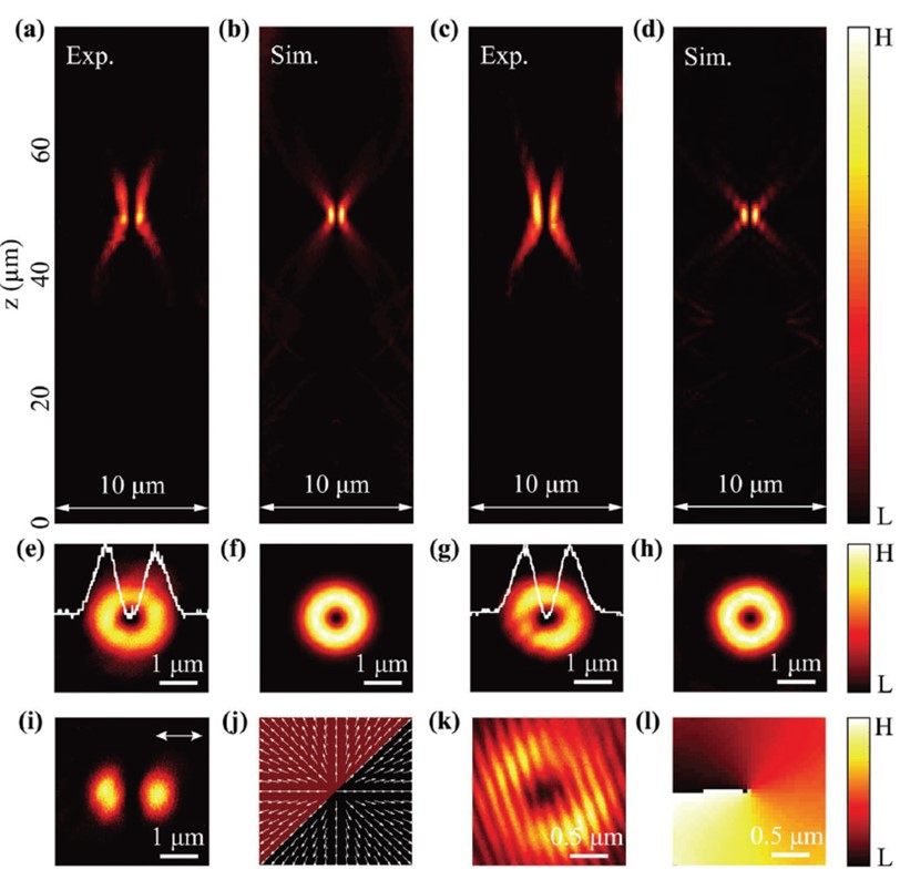圖 3. 平面透鏡在空間結(jié)構(gòu)光光源下的亞波長聚焦性能。我們考慮了兩種結(jié)構(gòu)光束,即徑向偏振矢量光束和渦流光束。如圖2所示,使用相同的平面透鏡(m=8)對聚焦性能進行了檢驗。(a-d) 在(a,b)矢量光束和(c,d)渦流光束情況下,沿 x - z 平面測量和模擬的衍射光場強度分布。(e,g)為實驗結(jié)果;(f,h)為模擬結(jié)果。為了研究焦平面的光狀態(tài),(i) 和 (k) 分別顯示了實驗矢量場的 x 分量和渦旋場的平面波干涉條紋;(j) 和 (l) 則分別顯示了矢量光束和渦旋光束在焦平面的偏振和相位分布。