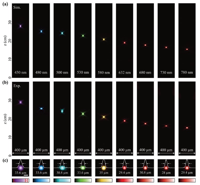 最后,我們將討論平面透鏡在可見光范圍內(nèi)的寬帶性能。我們用圖 4 中提到的更大規(guī)模的平面透鏡來演示這一問題。圖5a、b分別以數(shù)值和實驗方式顯示了在430nm和780nm之間的可見光波長下的寬帶聚焦特性。這些圖顯示了光場沿傳播距離的強度分布。圖中顯示所有波長的入射光束在平面透鏡后都表現(xiàn)出明顯的衍射聚焦效應(yīng)。由于平面透鏡的色散,焦點位置的移動幾乎與照明波長的倒數(shù)成線性關(guān)系。隨著光源波長的倒數(shù)而移動,而焦斑的大小基本保持不變。當波長從780到430nm時,可見光可以聚焦到zf=15到28.9cm的軸向位置,這一點值得評估。