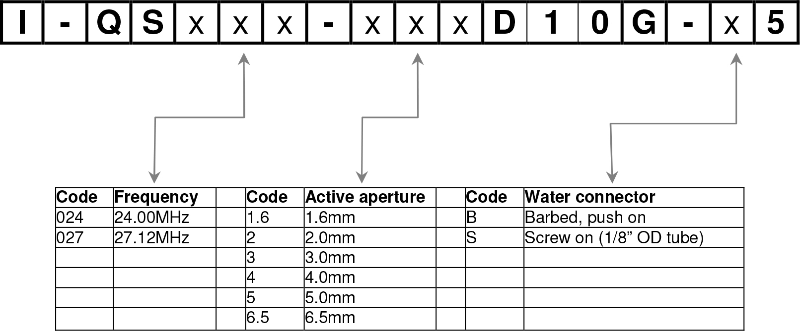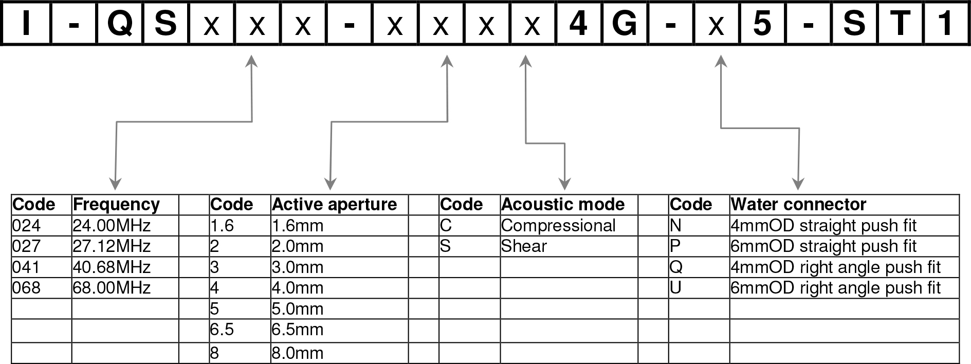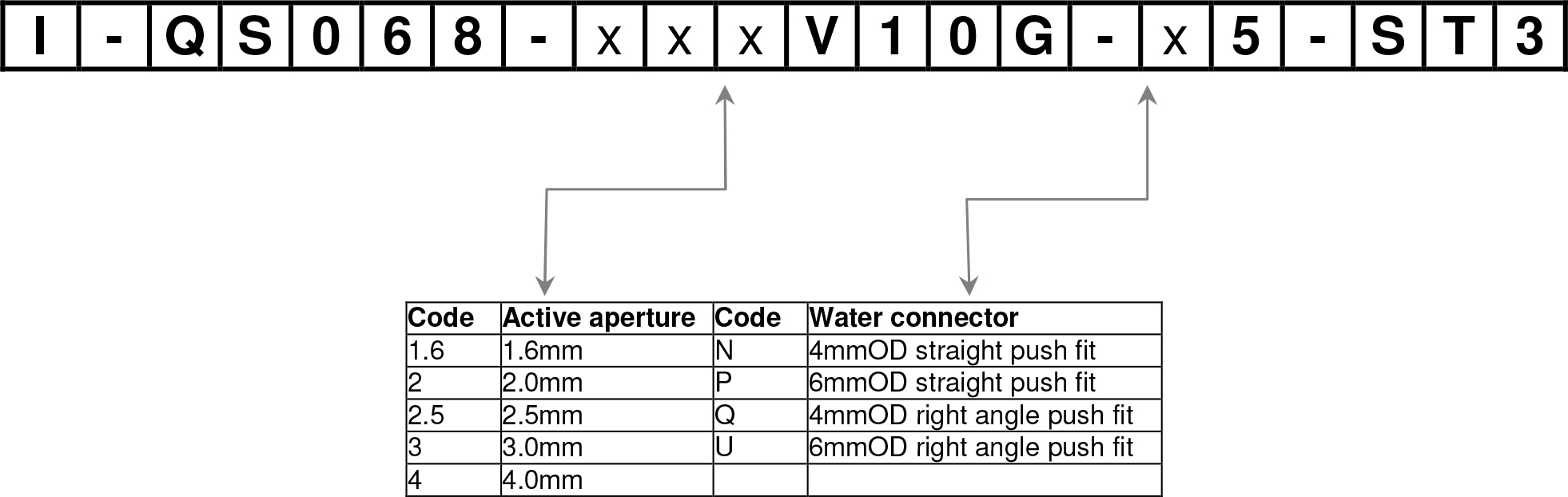 例如:I-QS068-2.5V10G-N5-ST3(Q開關,68MHz,2.5mm有效孔徑,VHE,石英晶體,1064nm,4mm OD 推入式水接頭,"牧馬"系列外殼,帶M3安裝孔)
