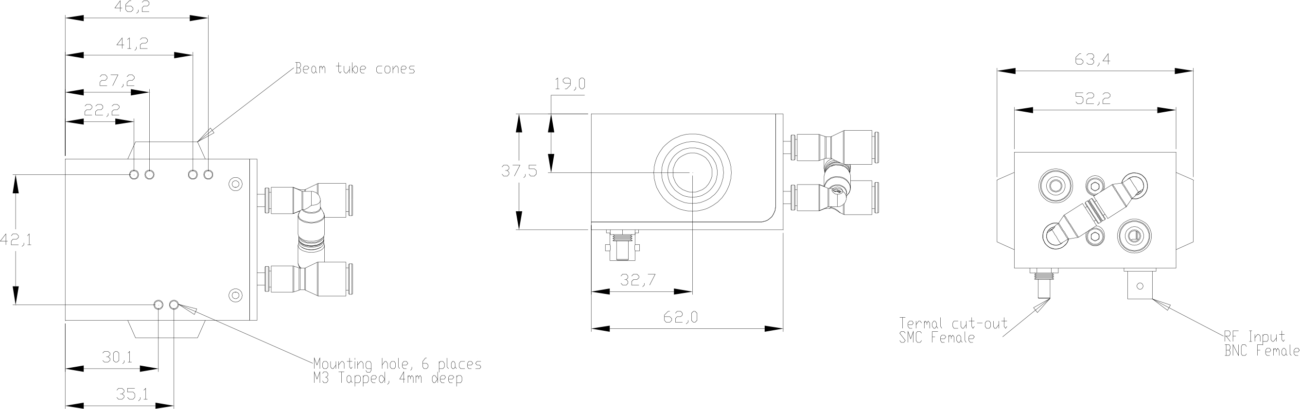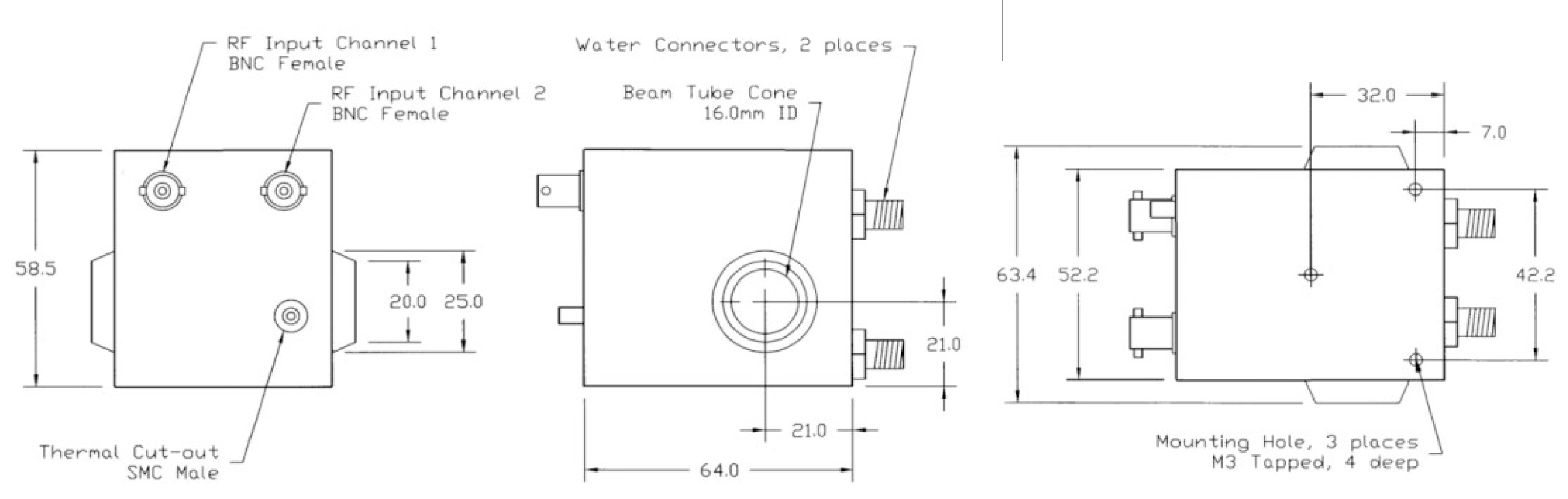 例如:I-QS027-4S4G-B5-AT1(Q開關,27.12MHz,4mm有效孔徑,S模式,熔融石英,1064nm,帶B型水接頭,帶M3安裝孔的標準外殼)注:–AT1表示M3安裝孔,對于英制6-32UNC安裝孔,不需要編號。40.68和68MHz選項僅適用于50W射頻驅(qū)動功率,40.68和68MHz選項僅適用于最大5.0mm的有效孔徑。