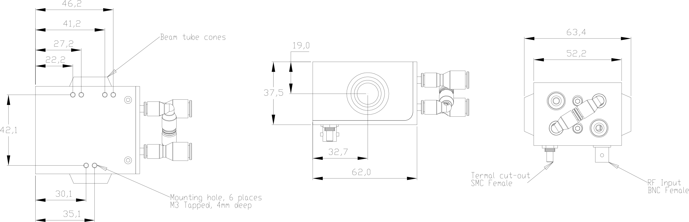 例如:I-QS027-4S4G-B5-AT1(Q開關,27.12MHz,4mm有效孔徑,S模式,熔融石英,1064nm,帶B型水接頭,帶M3安裝孔的標準外殼)注:如所示,–AT1表示M3安裝孔,對于英制6-32UNC安裝孔,不需要編號。40.68和68MHz選項僅適用于50W射頻驅(qū)動功率,40.68和68MHz選項僅適用于最大5.0mm的有效孔徑。