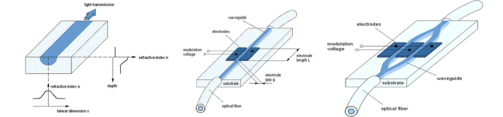 集成光波導(dǎo)方案(左圖),相位調(diào)制器(中圖),振幅調(diào)制器(右圖),