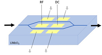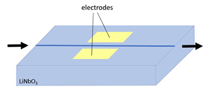 相位調(diào)制器由位于鈮酸鋰中的單個(gè)波導(dǎo)組成,波導(dǎo)兩側(cè)各有兩個(gè)電極(下圖)。這是最簡(jiǎn)單的調(diào)制器類型。