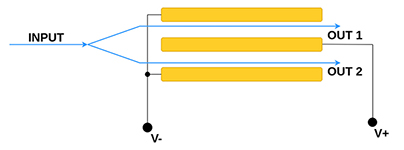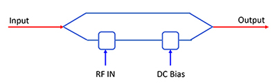 強(qiáng)度調(diào)制器使用馬赫-曾德爾干涉儀(MZI)的結(jié)構(gòu),將波導(dǎo)分成兩條路徑并重新組合(下圖)。電極被放置在兩個(gè)波導(dǎo)路徑周圍,以在分裂時(shí)調(diào)制光中的相位。當(dāng)路徑重新組合時(shí),光路根據(jù)相位經(jīng)歷構(gòu)造或解構(gòu)干涉,從而調(diào)制光強(qiáng)度。